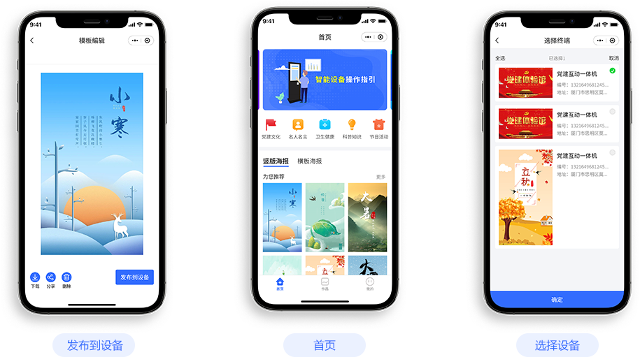 平臺內(nèi)置近1000+套設計模板,覆蓋應用場景、包括:節(jié)日宣傳、科普知識、公告通知、詩詞鑒賞、節(jié)日活動、衛(wèi)生健康等主題。用戶不僅可以快速修改模板內(nèi)容,還可以插入圖片等操作,并發(fā)布到云屏設備。